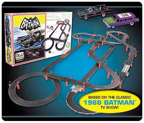 O autorama Batman 1966 TV Slot Car Race Track Set vem com 2 carrinhos, o Batmóvel e o Jokermobile, mais 15 metros de pista que podem ser montadas de cinco maneiras diferentes. O autorama do Batman também tem função de troca de pista e estreitamento de pista para tornar as corridas ainda mais emocionantes.